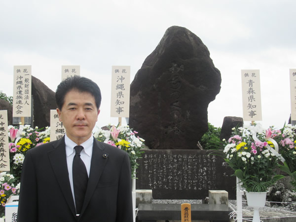 Aこちらは沖縄で県ゆかりの戦没者を慰霊するみちのくの塔で献花しました。